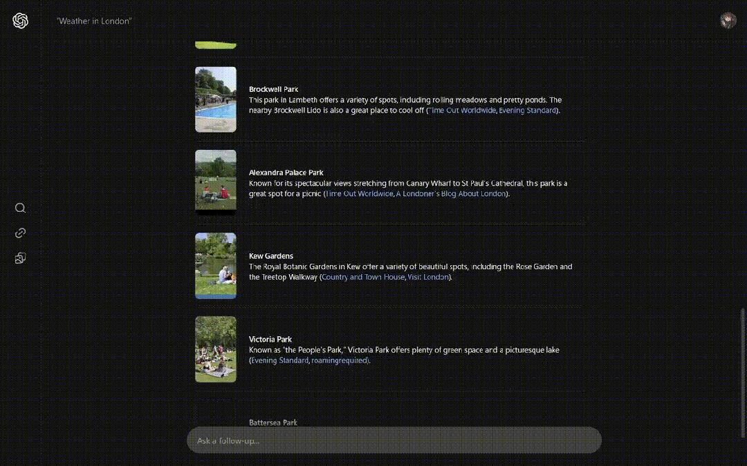 比如询问它伦敦天气,SearchGPT先给出了未来七天的天气预报。