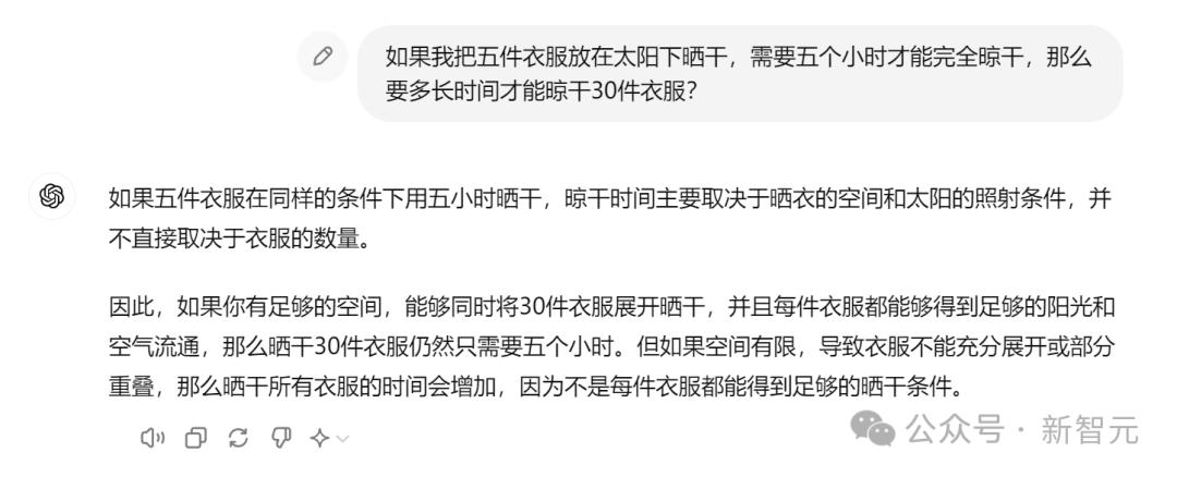 比如一个非常流行的例子是,我们问ChatGPT:「如果我把五件衣服放在太阳下晒干,需要五个小时才能完全晾干,那么要多长时间才能烘干30件衣服?」